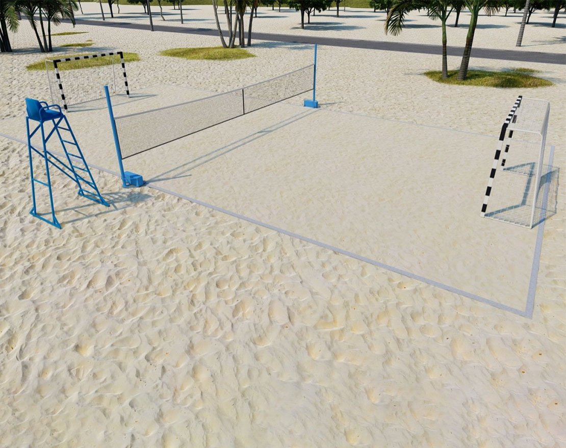 Общая площадь комплекта составляет 18×9 метров, что позволяет комфортно играть как в футбол, так и в волейбол.