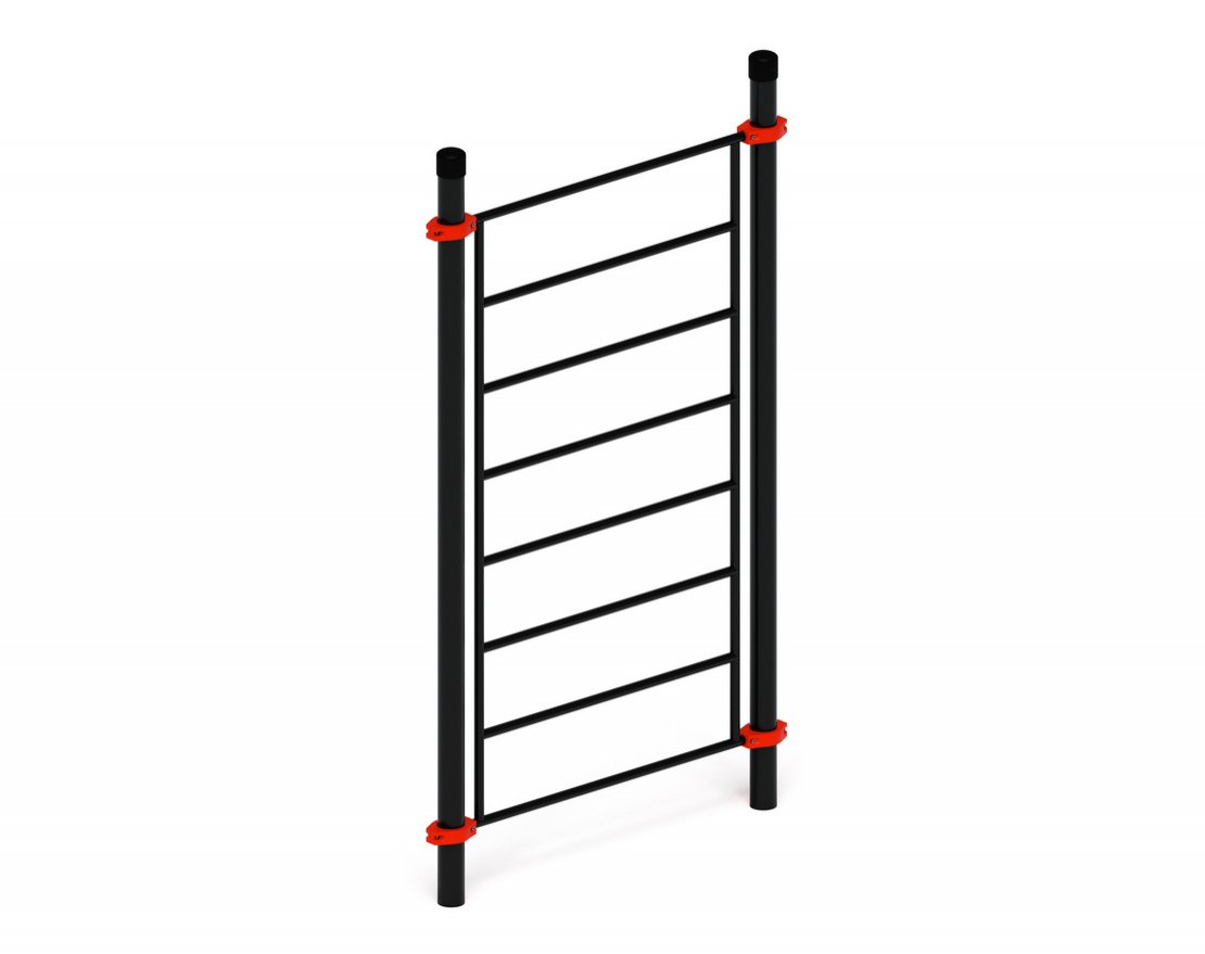 Комплекс для занятий спортом на открытом воздухе представляет собой устойчивую и прочную конструкцию, состоящую из двух опорных столбов высотой 2 600 миллиметров. К этим столбам при помощи специальных хомутов надёжно крепится шведская стенка.