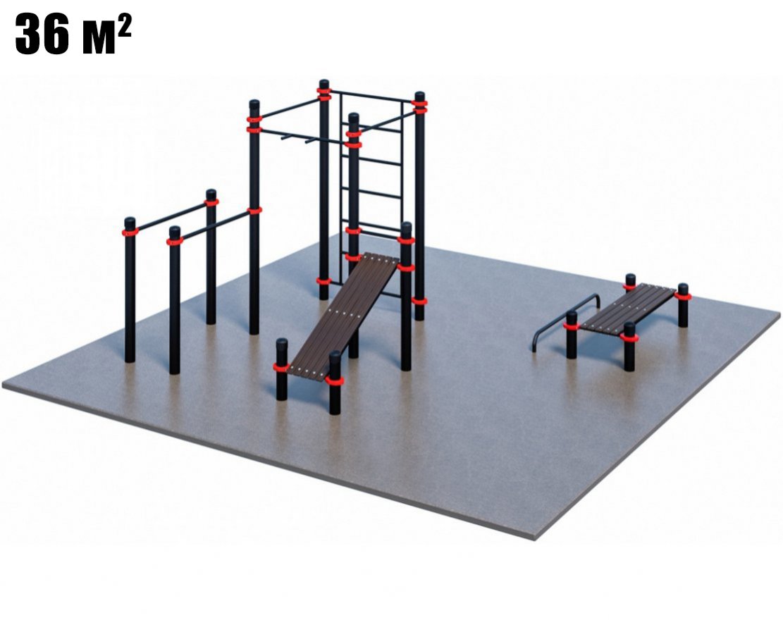 Площадка имеет размер 6 х 6 м и общую площадь 36 кв. м. Она изготовлена из стали и включает в себя следующие элементы: