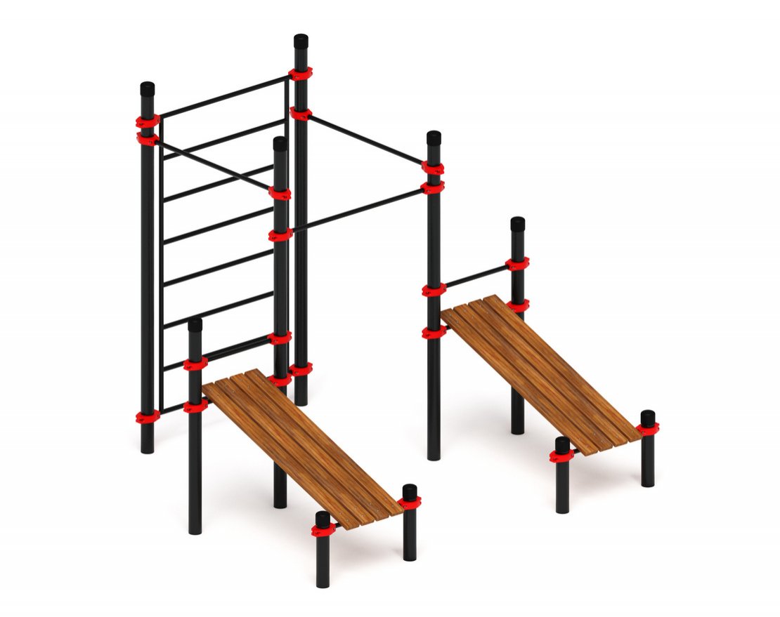 Воркаут-комплекс, размещённый на улице, представляет собой функциональное и безопасное пространство для занятий спортом. Комплекс состоит из десяти опорных столбов, выполненных из трубы диаметром 89 мм с толщиной 3,5 мм стенки, что обеспечивает надёжность конструкции.