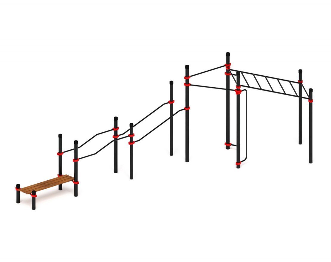 Площадка оборудована специальными тренажёрами и снарядами, которые позволяют выполнять разнообразные упражнения для развития силы, выносливости, гибкости и координации движений. Тренажёры имеют нескользящее покрытие и удобные поручни для поддержки.