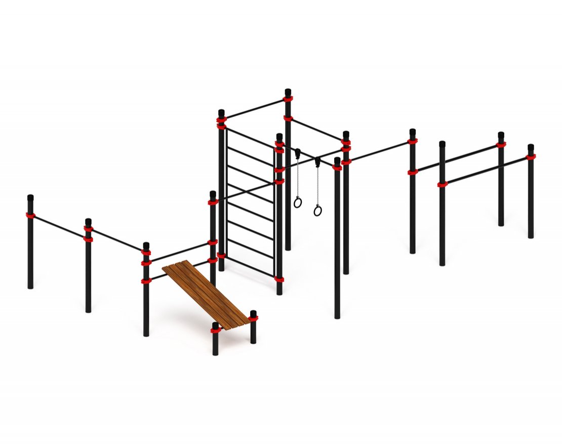 Комплекс представляет собой набор из опорных столбов, расположенных на улице, и различных спортивных снарядов, закреплённых на столбах при помощи хомутов. Комплекс включает в себя: