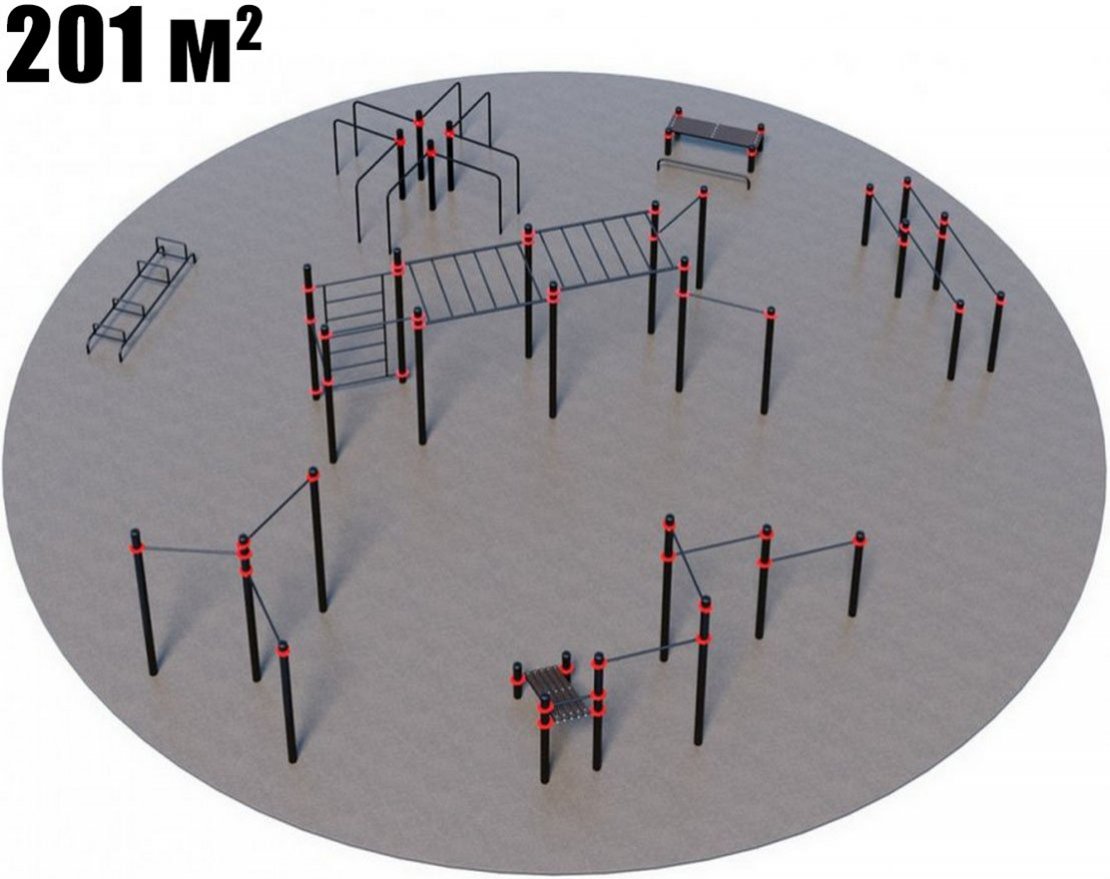 В комплект площадки входят различные спортивные снаряды: