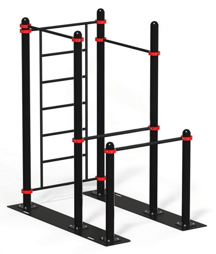 Спортивный комплекс — сборная металлическая конструкция, которая состоит из опорных столбов, перекладин, шведской стенки, брусьев и поручней. Комплекс легко устанавливается и демонтируется благодаря разборной конструкции и креплению на хомутах.