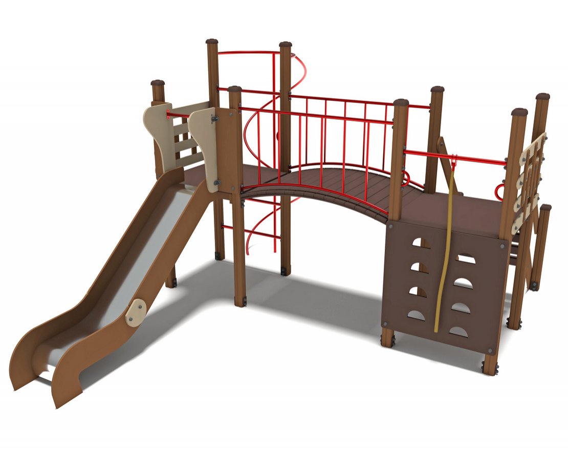 Детский игровой комплекс предназначен для детей от 5 лет. Несущие столбы комплекса должны быть выполнены из клееного бруса сечением 90х90 мм. Снизу столб должен заканчиваться металлическим подпятником сечением Ø 42 мм, который бетонируется в землю. Для увеличения жесткости конструкций на опорные столбы должны крепиться лаги, собранные в шип, на которые закрепляются прогоны полов, изнутри зафиксированные специальными оцинкованными уголками. Деревянные детали должны быть тщательно отшлифованы, загрунтованы и окрашены профессиональными двухкомпонентными красками в заводских условиях. Полы площадок изготовлены из ламинированной фанеры 18 мм. Игровой комплекс состоит из двух башен, с размером полов не менее 1000х1000 мм соединенные переходом в виде «дуги», который изготовлен из металлического каркаса окрашенного порошковыми красками и ламинированной фанеры с нескользящим покрытием, толщиной 24 мм. Скат горки изготовлен из единого листа нержавеющей стали толщиной 1,5 мм и утоплен в паз фанерного борта. Наличие бортов горки высотой 100 мм обязательно в целях исключения травмирования детей. Горка должна иметь стартовую площадку с перекладиной сечением Ø 27 мм, заставляющую ребенка присесть, полосу разгона и участок торможения. Ступеньки лестницы комплекса должны быть выполнены из ламинированной нескользящей влагостойкой ламинированной фанеры толщиной 18 мм. Ко второй башне прикреплен рукоход и лазрешетка, которые выполнены из трубы сечением Ø 32 мм и Ø 27 мм. Детский игровой комплекс включает в себя турник сечением Ø 27 мм, фанерный скалолаз из окрашенной фанеры толщиной 18 мм, полипропиленовый шестипрядный, армированный металлом канат тросовой свивки с резиновым сердечником (для увеличения гибкости), зажимы выполненные из алюминиевого сплава. ГОСТ Р 52301-2013, ГОСТ Р 52169-2012, ГОСТ Р 52168-2012