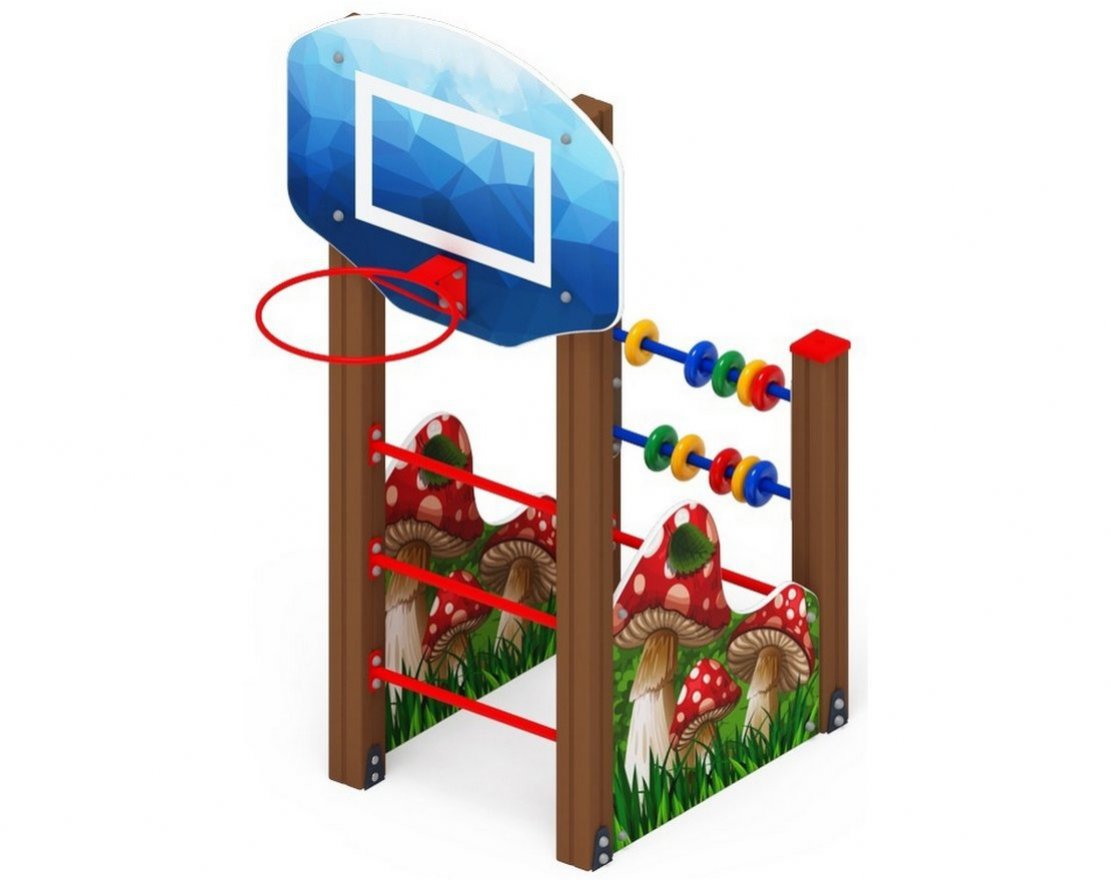 Баскетбольный щит представляет собой щит березовой фанеры габаритами 800х1000, закрепленный между двумя стойками на высоте 2000 мм. Имеет тщательную обработку торцов и окраску синего и белого цвета.