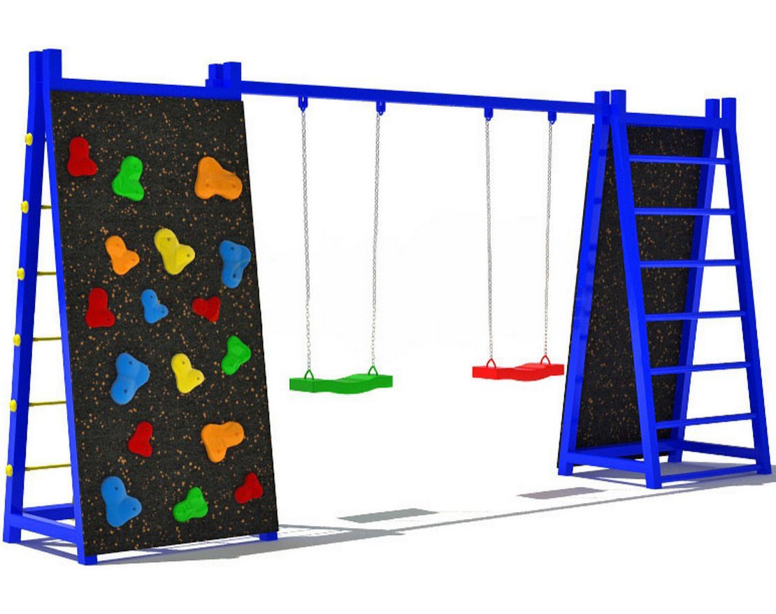 Очень стильное и яркое решение современной площадки, сочетающей игровые и спортивные элементы. Две качели для детей и взрослых, две лесенки для лазания и сразу две наклонных плоскости, имитирующих стены для скалолазания – это целый развлекательно-спортивный комплекс для детей, умещенный на небольшой по размеру площадке.