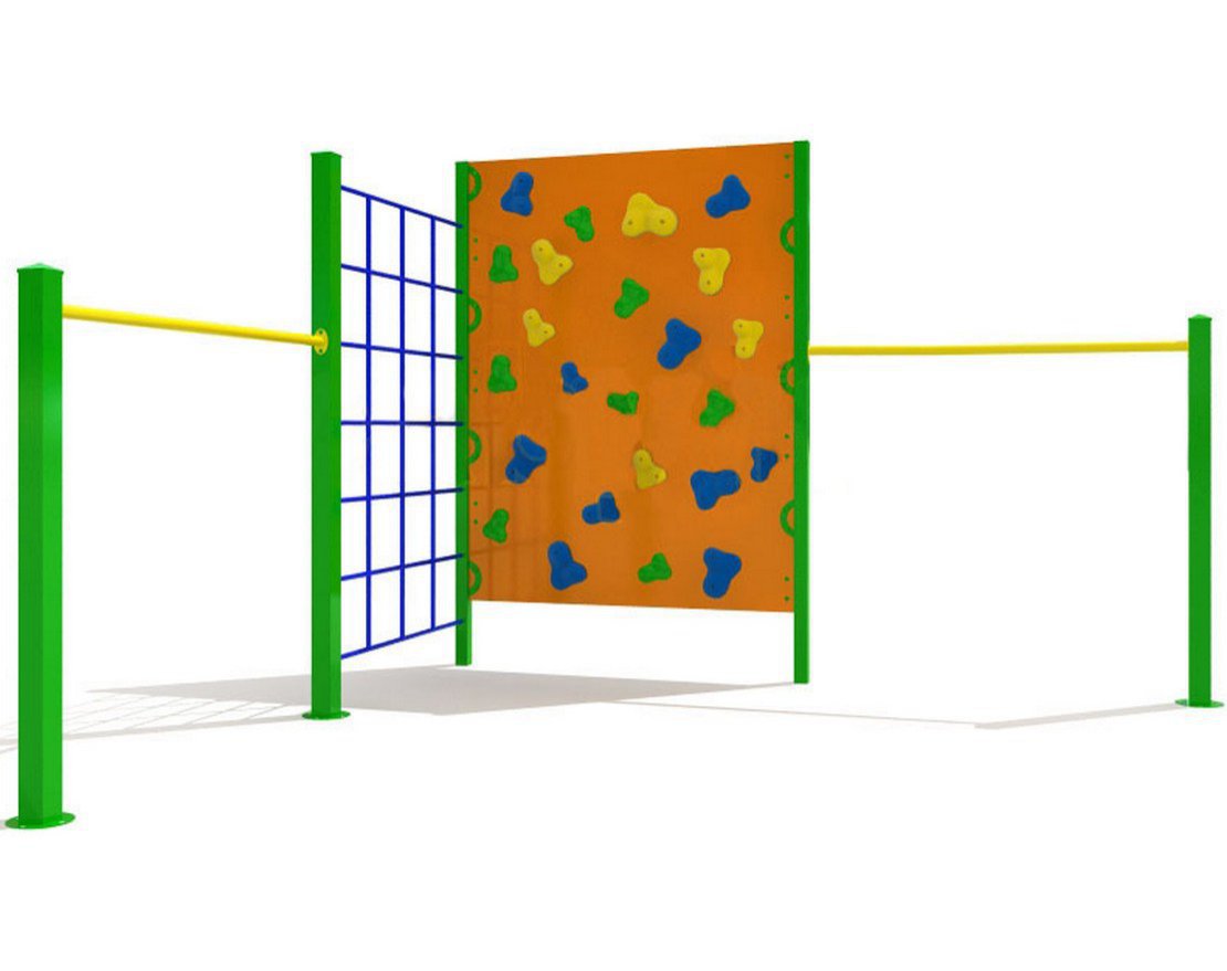 Комплекс включает в себя различные элементы, такие как турники, лесенка-клетка и стена для скалолазания, которые позволяют детям выбирать активности по своему вкусу и развивать различные группы мышц.