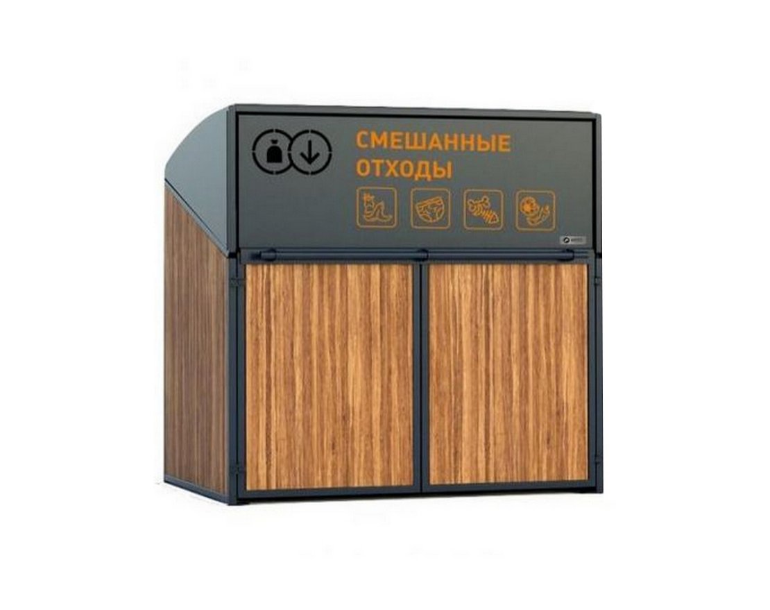 В данный контейнерный шкаф вмещается один большой контейнер объемом 1100 л. Либо один стандартный контейнер на 600-800 л, либо два контейнера до 360 литров.