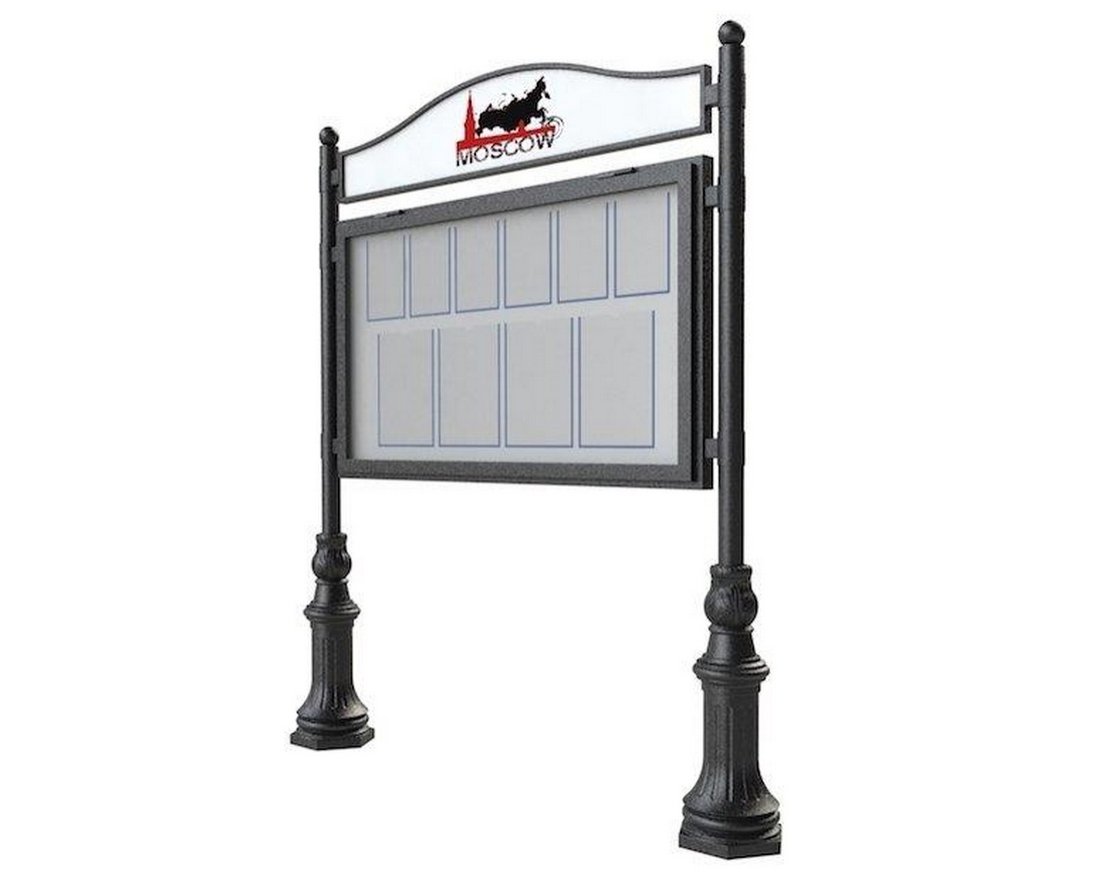 Уличная конструкция представляет собой трёхметровую стойку с информационным носителем, которая изготовлена из высококачественных материалов. Цоколь выполнен из чугунного художественного литья и покрыт порошковой краской чёрного или серого цвета. Стальные столб и элементы также покрыты порошковой краской. Это обеспечивает надёжную защиту от воздействия погодных условий и долгий срок службы конструкции.
