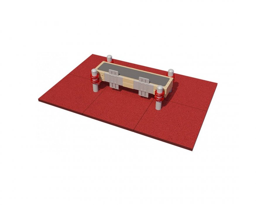 Скамья изготовлена из стального профиля, покрытого цинковым грунтом, и влагостойкого бруса, что обеспечивает её долговечность и устойчивость к внешним воздействиям. Измерительные рейки также выполнены из нержавеющей стали, что гарантирует их надёжность и долгий срок службы.