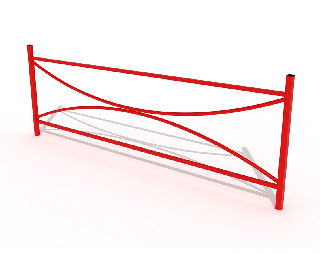 Стойки секции выполнены из профильной трубы 40х40 мм, горизонтальные перекладины из профиля 25х25 мм. Гнутые элементы из трубы - наружным диаметром 27 мм. Металл имеет плавные радиусы, тщательную обработку швов, покрыт порошковой краской в красный цвет.