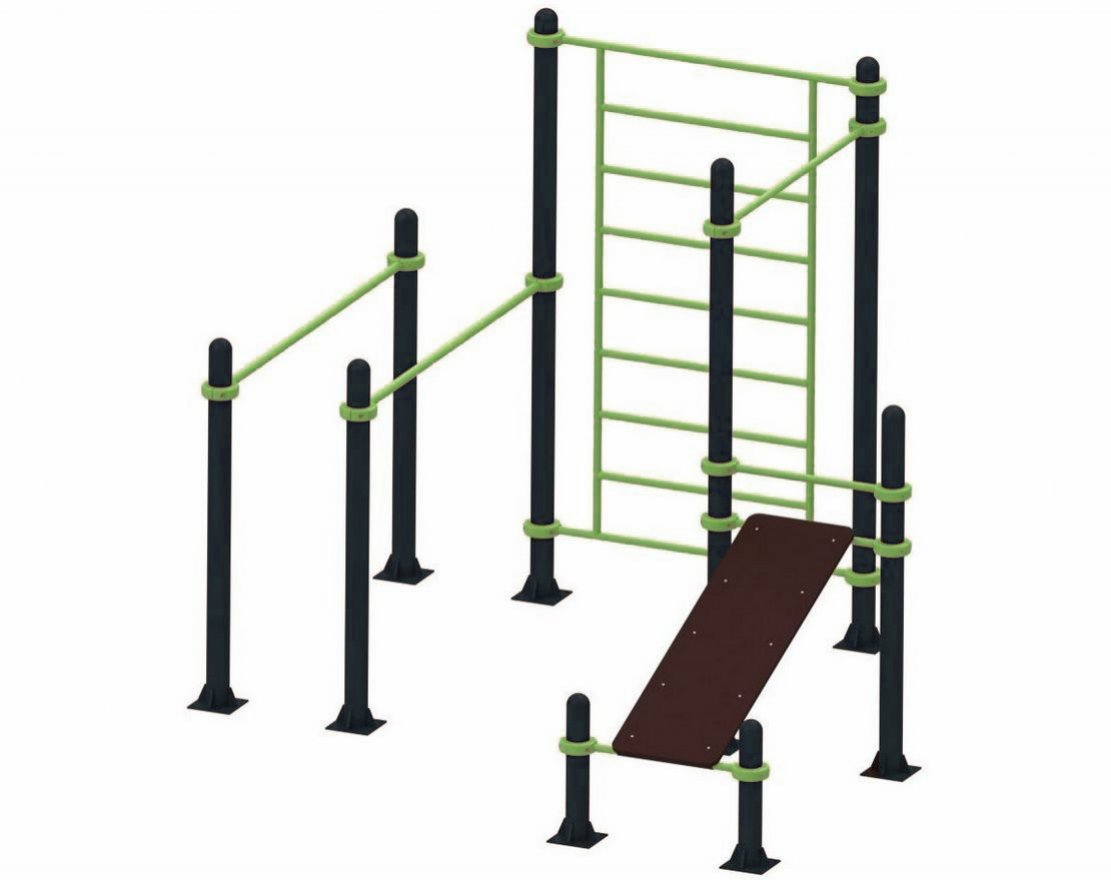 Турник незаменим для любой спортивной площадки. Он позволяет выполнять подтягивания и подъём переворотом, что способствует развитию мышц рук и спины. Перекладина турника регулируется по высоте и имеет следующие характеристики: