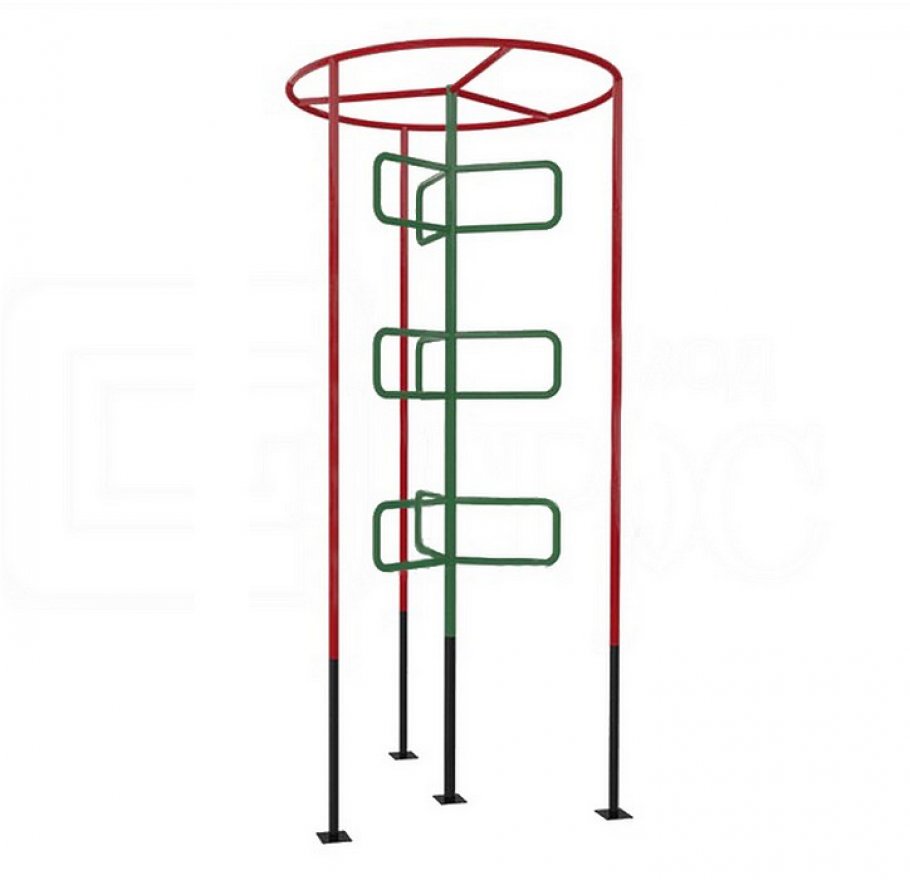 - Лаз собран из прочных металлических труб. Покрытие – полимерно-порошковая краска. Она защищает конструкцию от воздействия погодных условий, включая ультрафиолетовое излучение.