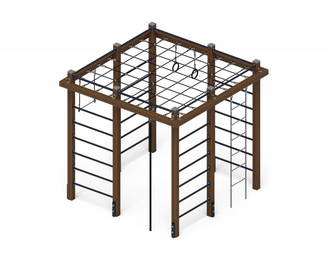 Выполнена из шестипрядного армированного полиамидного каната тросовой свивки диаметром 16 мм, на брус обвязки стоек крепится при помощи скоб через коуши. Канаты в местах пересечения фиксируются при помощи пластикового крестообразного соединителя для канатов диаметром 16мм. Канаты помещаются в пазы соединителя, которые защёлкиваются между собой и фиксируются саморезом. Концы канатов заканчиваются коушем и фиксируются зажимной втулкой. Габариты 2370х2370 мм.