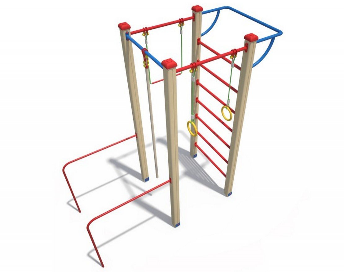 Спортивный комплекс предназначен для детей от 7 лет. Несущие столбы комплекса должны быть выполнены из клееного бруса сечением 90x90 мм. Сверху столб должен заканчиваться пластиковой заглушкой, снизу столб должен заканчиваться металлическим подпятником сечением Ø 42 мм, который бетонируется в землю.