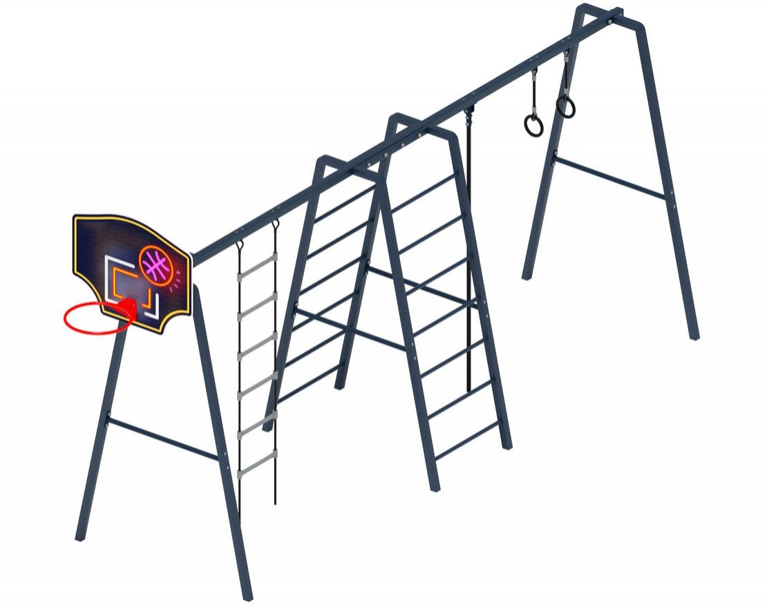 Состоит из металлической сварной подвески из трубы диаметром 32 мм (L=1700мм), металл имеет плавные радиусы и тщательную обработку швов, покрыт порошковой краской в красный цвет, канат полиамидный диаметром 26 мм, и колец гимнастических, подвешенных к полипропиленовым канатам. В комплект входит- 1 канат для лазанья, два каната для крепления колец и кольца гимнастические.