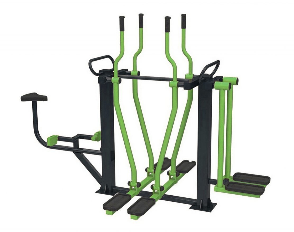 Уличный тренажёр «Лыжники+Велосипед+Разведение» — это комплекс из трёх элементов, предназначенный для тренировки различных групп мышц и суставов. Тренажёр может использоваться одновременно одним или двумя пользователями.