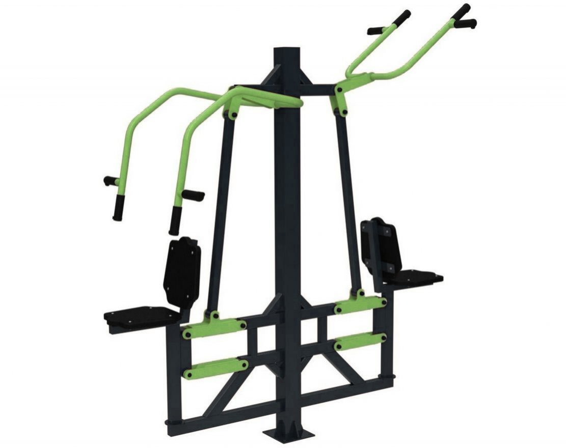 Представляем вам уличный тренажёр, который сочетает в себе две функциональные модели: «Жим от груди», предназначенный для тренировки мышц груди, и «Вертикальную тягу», разработанную для укрепления трицепсов. Оба тренажёра изготовлены из прочной стали и оснащены надёжной рычажной системой, что обеспечивает долговечность и безопасность во время тренировок.