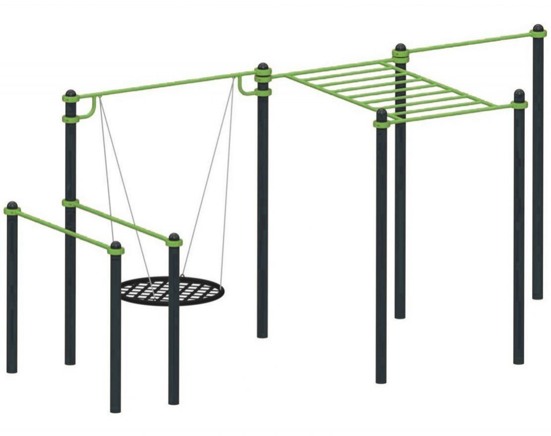 Элементы комплекса изготовлены из прочной стали и покрыты порошковой краской. Это обеспечивает их долговечность и устойчивость к внешним воздействиям.
